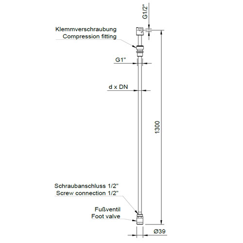 Sauglanze wahlweise d25/DN6 oder d25/DN12 aus PE elektrisch leitfähig, verstellbar mit Fussventil - für Entnahme aus IBC-Containern Durchfluss: max. 50 l/h bei Größe d25 / DN6 Durchfluss: max. 200 l/h bei Größe d25 / DN12 - ohne Niveaukontakte - Werkstoff: PE-el elektrisch leitfähig, schwarz - Baulänge 1300 mm - Anschluss mit Gewindemuffe G1/2 Innengewinde - Gewindeanschluss horizontal - Saugrohr wahlweise d25/Innen-d 6 mm oder d25/Innen-d 12 mm - Klemmverschraubung aus PE-EL, d25/G2 Zoll Außengewinde, oben am Multi Flex Block® einschraubbar Fussventil zur Richtungsbegrenzung und Ansaugung von Fluiden - Ein Zurückströmen der Flüssigkeit entgegen der Durchflussrichtung wird zuverlässig verhindert - Fussventil-Abmaße: Aussendurchmesser 39 mm x 66 mm - Eingang mit Sieb-Bohrungen d 3 mm - Kegel federbelastet, öffnet bei 0,2 bar - Werkstoff Rückschlagfeder: Hastelloy C4 - O-Ringe wahlweise EPDM, FPM oder FEP-FPM (FEP-ummantelt) - Werkstoff Fussventilgehäuse PE-el, demontierbar am Gehäuse-Anschluss: G1/2 Innengewinde - Druckstufe: SDR11 - Einbaulage senkrecht - elektrisches Potential wird abgeleitet, geeignet für Ex-Zone 1 und 2 |