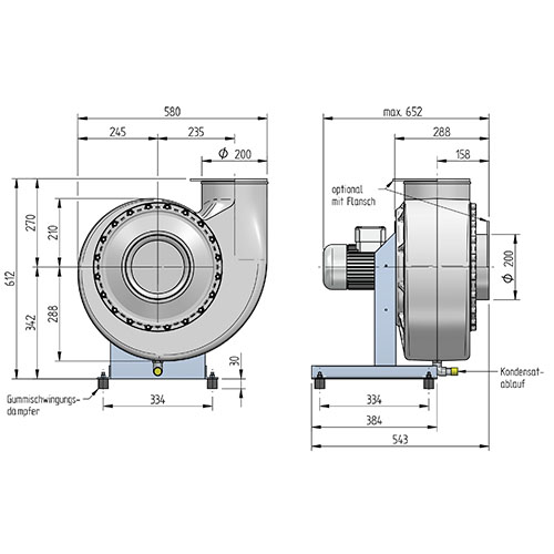 Korrosionsbeständiger Kunststoff-Radialventilator mit Gehäuse aus PE-el, elektrisch ableitfähig, in gesinterter Ausführung, einseitig saugend, Einlaufdüse mit Dichtung als Inspektionsöffnung, leicht demontierbar, Kondensatstutzen an tiefster Stelle des Gehäuses, Splitterschutz gemäß UVV als kunststoffbeschichtetes Drahtgeflecht. Laufrad PP-el mit rückwärts gekrümmten Schaufeln, elektrisch ableitfähig, statisch und dynamisch ausgewuchtet, Auswuchtgüte mindestens G 6.3 (DIN ISO 21940-11), mit Taperlock- Buchse auf der Motorwelle befestigt. Ventilatorgestell in kräftiger Stahlschweißkonstruktion in verzinkter Ausführung, mit Motortragplatte. Ventilatorgestell geeignet zur Aufnahme des Ventilatorgehäuses mit Laufrad sowie des Motors. Minimalspaltdichtung am Wellendurchgang.Gummischwingungsdämpfer und elastische Manschetten mit VA-Spannbändern für Saug- und Druckseite sind im Lieferumfang enthalten.
