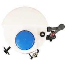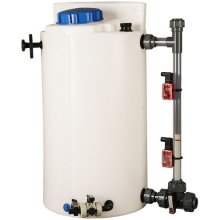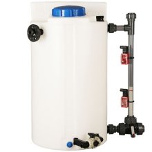Dosierbehälter mit außenliegender Füllstandsanzeige, Schwimmerschalter und Drei-Wege-Kugelhahn
