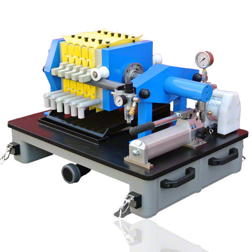 Unsere Laborfilterpressen sind speziell für den Einsatz in Laborumgebungen entwickelt worden und bieten eine präzise Filtration von Flüssigkeiten. Mit ihrer soliden Stahlkonstruktion bieten sie Stabilität und Langlebigkeit. Die Pressengestelle bestehen aus massiven Ständern und Holmen, die fest miteinander verschraubt sind. Die Filterpresse ist auf einer Kunststoff-Unterkonstruktion montiert, die einen einfachen Transport mit gängigen Flurfördermitteln wie Gabelstaplern ermöglicht.