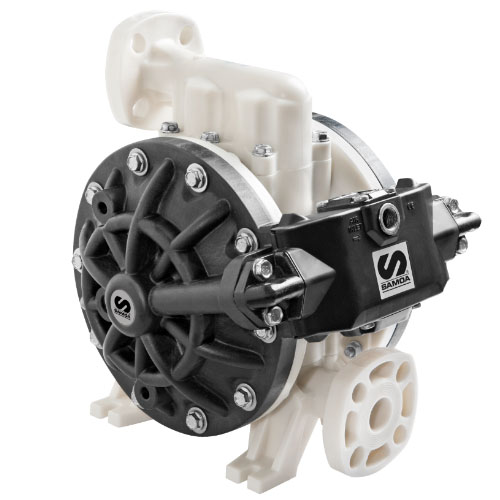 Luftbetriebene Doppelmembranpumpen zum Dosieren, Sprühen, Umpumpen, Abpumpen und Verteilen einer Vielzahl von Flüssigkeiten. Ausgelegt auf maximale Leistung und Effizienz bei Anwendungen mit hohem Durchfluss. Kunststoffpumpen werden für einige Eintauchanwendungen und aggressive Atmosphären empfohlen. Für den Einsatz in explosionsgefährdeten Bereichen sind vollständig erdungsfähige Pumpen mit ATEX-Zertifizierung erhältlich (Ex II2 GD IIB/IIC 95 ?C) Übersetzungsverhältnis: 1:1 Max. freie Fördermenge*: 200 l/Min. (53 gal/Min.) Fördermenge pro Hub (ca.)*: 0,5 Liter (0,13 US gal) Fördermenge je Zyklus (2 Hübe)*: 1 Liter (0,26 US gal) Luftdruck-Betriebsbereich: 1,5 bis 8 bar (22 bis 115 psi) Max. Größe der Feststoffe in Suspension: 6 mm (1/4 Zoll) Max. Trockenansaughöhe*: 5 m (16 Fuß) Max. Nassansaughöhe*: 8 m (26 Fuß) Gewicht: 10,5 kg (23,15 lb) Anschluss Saugseite: 1 Zoll DIN PN-10 DN25 Flansch und ANSI B16,5 1 Zoll 150 lb Flansch Anschluss Druckseite: 1 Zoll DIN PN-10 DN25 Flansch und ANSI B16,5 1 Zoll 150 lb Flansch Luftanschluss: 3/8 Zoll NPSM (F) Materialien der medienberührenden Teile Siehe Tabelle |