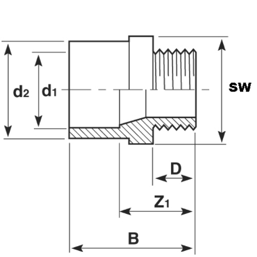 | -geeignet nur für Kunststoffgegengewinde -Anschluss: Klebemuffe bzw. -stutzen/Außengewinde konisch -SW=Schlüsselweite |